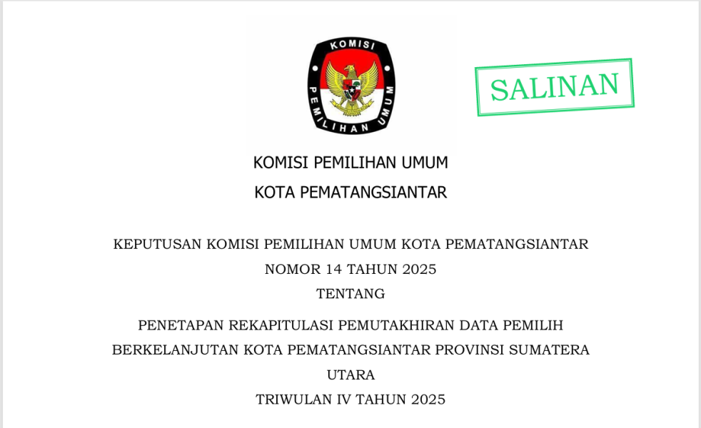 KEPUTUSAN KOMISI PEMILIHAN UMUM KOTA PEMATANGSIANTAR NOMOR 14 TAHUN 2025 TENTANG PENETAPAN REKAPITULASI PEMUTAKHIRAN DATA PEMILIH BERKELANJUTAN KOTA PEMATANGSIANTAR PROVINSI SUMATERA UTARA TRIWULAN IV TAHUN 2025 PENGUMUMAN KLIK DISINI ....