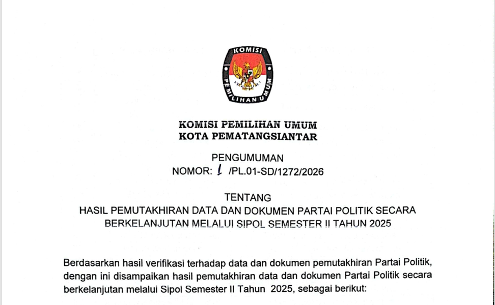PENGUMUMAN KOMISI PEMILIHAN UMUM KOTA PEMATANGSIANTAR NOMOR:1/PL.01-SD/1272/2026 TENTANG HASIL PEMUTAKHIRAN DATA DAN DOKUMEN PARTAI POLITIK SECARA BERKELANJUTAN MELALUI SIPOL SEMESTER II TAHUN 2025 PENGUMUMAN KLIK DISINI ....