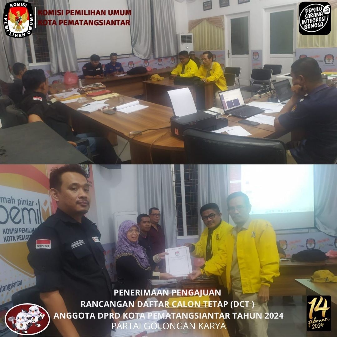 KPU Kota Pematangsiantar menerima Pengajuan Perubahan Rancangan Daftar Calon Tetap (DCT) Anggota Dewan Perwakilan Rakyat Daerah (DPRD) Kota Pematangsiantar Partai GOLKAR pada Pemilu 2024 bertempat di Kantor KPU Kota Pematangsiantar Selasa, 3 Oktober 2023. Pengajuan dilakukan oleh Marli Suryatama Sekretaris Partai Golkar dan Pengurus tingkat Kota Pematangsiantar. Dalam kegiatan tersebut diterima oleh Nurbaiyah Siregar Anggota KPU Kota Pematangsiantar dan Sekretariat KPU Kota Pematangsiantar serta turut dihadiri oleh Ketua dan Anggota Bawaslu Kota Pematangsiantar dan Sekretariat Bawaslu Kota Pematangsiantar