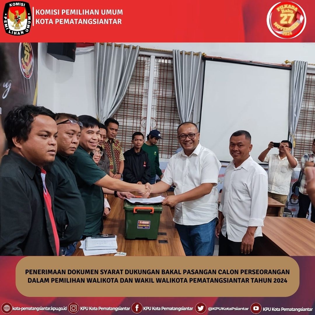 Pematangsiantar, kota-pematangsiantar.kpu.go.id Hingga Minggu, 12 Mei 2024 Pukul 23.59 WIB hanya 1 (satu) bakal pasangan calon perseorangan Walikota dan Wakil Walikota Pematangsiantar yang menyerahkan dokumen dukungan minimal pemilih ke KPU Kota Pematangsiantar. Hendra Simanjuntak dan Kiswandi sebagai Bakal Pasangan Calon Perseorangan  dalam Pemilihan Walikota dan Wakil Walikota Pematangsiantar Tahun 2024 datang pukul 22.10 WIB," Bakal Pasangan Calon Perseorangan Walikota dan Wakil Walikota menyerahkan dokumen dukungan Minimal Pemilih sebanyak 22.073 dan sebaran di 8 (delapan) kecamatan, Surat Pernyataan Dukungan (Model B.1-KWK-PERSEORANGAN), Model B.PENYERAHAN.DUKUNGAN.KWK dan Model B.JUMLAH.DUKUNGAN.KWK diserahkan dalam bentuk Fisik. KPU Kota Pematangsiantar melakukan pemeriksaan Dokumen Fisik Persyaratan Dukungan Bakal Pasangan Calon Perseorangan Walikota dan Wakil Walikota Pematangsiantar dengan hasil jumlah Pendukung Bakal Pasangan Calon Walikota dan Wakil Walikota Pematangsiantar sebanyak 20.805 dan sebaran di 8 (delapan) kecamatan. Selanjutnya KPU Kota Pematangsiantar menyerahkan tanda terima Model PENERIMAAN.DUKUNGAN.KWK-KPU dan Berita Acara Model BA.PENERIMAAN.DUKUNGAN.KWK-KPU kepada Bakal Pasangan Calon Perseorangan Dalam Pemilihan Walikota dan Wakil Walikota Pematangsiantar Tahun 2024, Proses penerimaan dan pemeriksaan Dokumen Dukungan disaksikan oleh Bawaslu Kota Pematangsiantar.