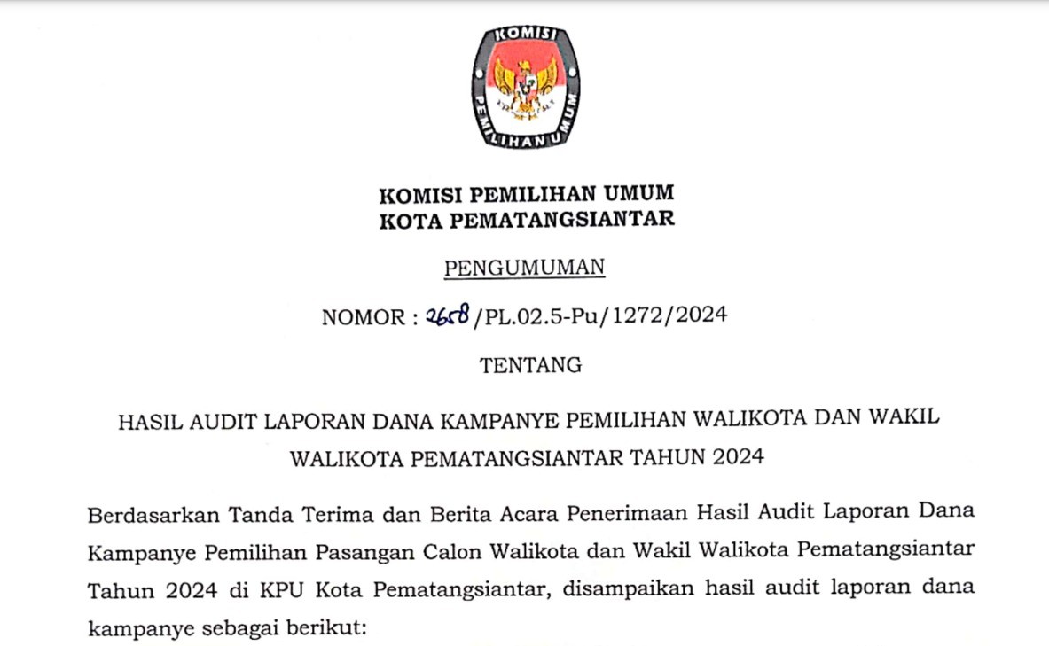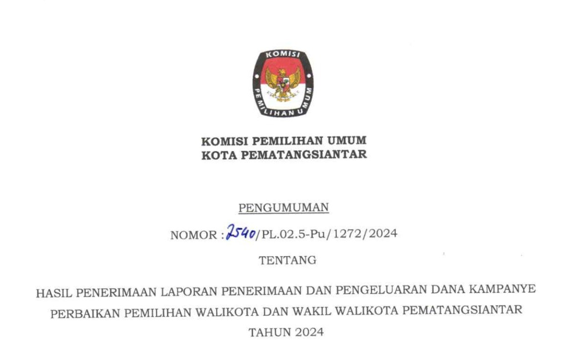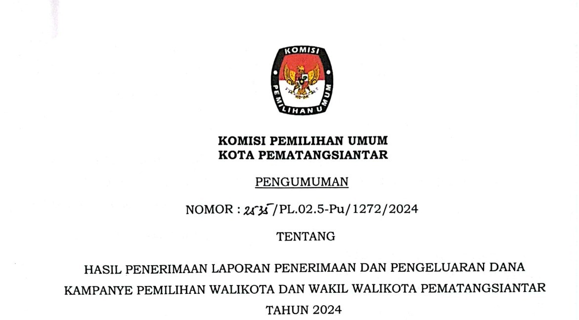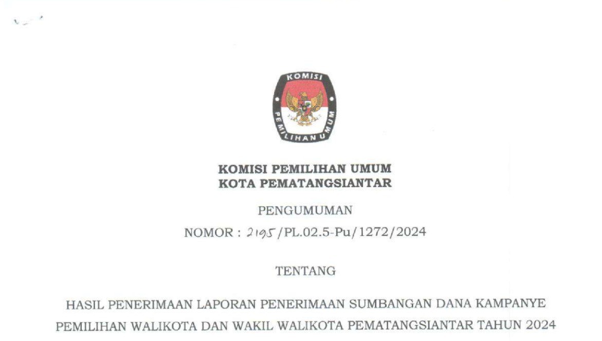 HASIL PENERIMAAN LAPORAN PENERIMAAN SUMBANGAN DANA KAMPANYE PEMILIHAN WALIKOTA DAN WAKIL WALIKOTA PEMATANGSIANTAR TAHUN 2024