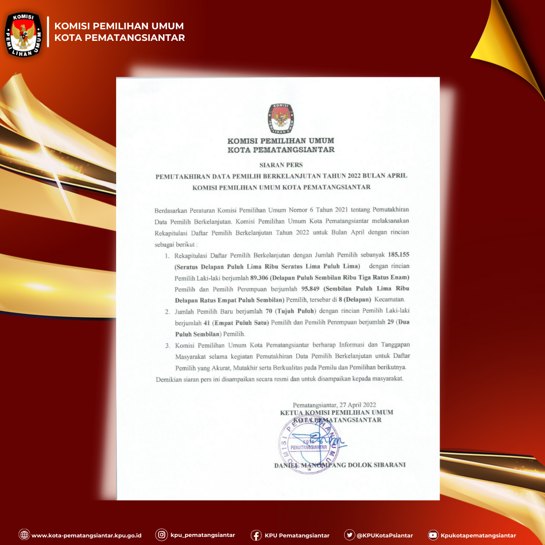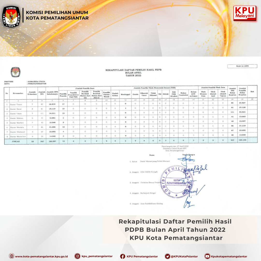 Hasil Rekapitulasi Daftar Pemilih Berkelanjutan periode Bulan April 2022 KPU Kota Pematangsiantar dapat didownload melalui link berikut KLIK DISINI