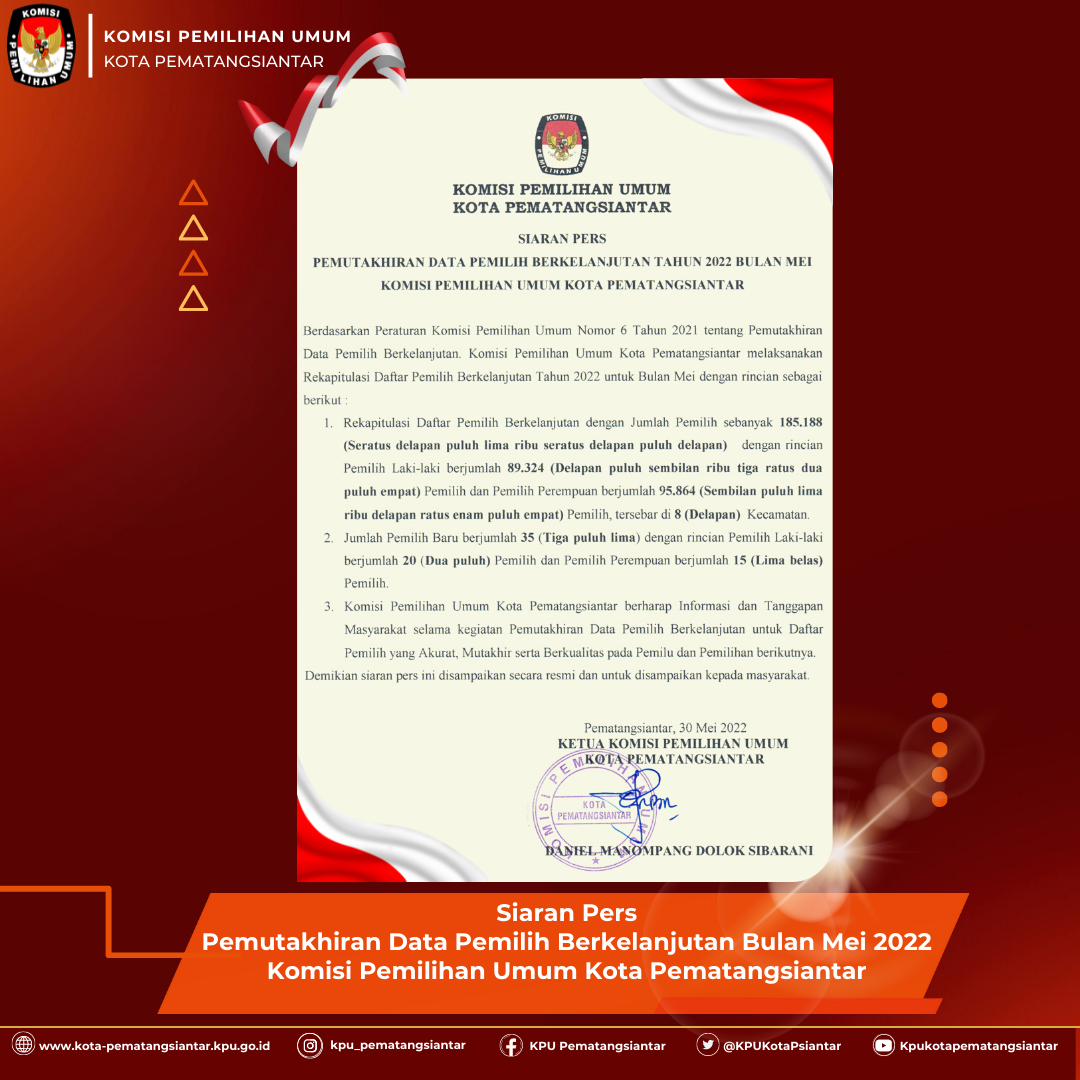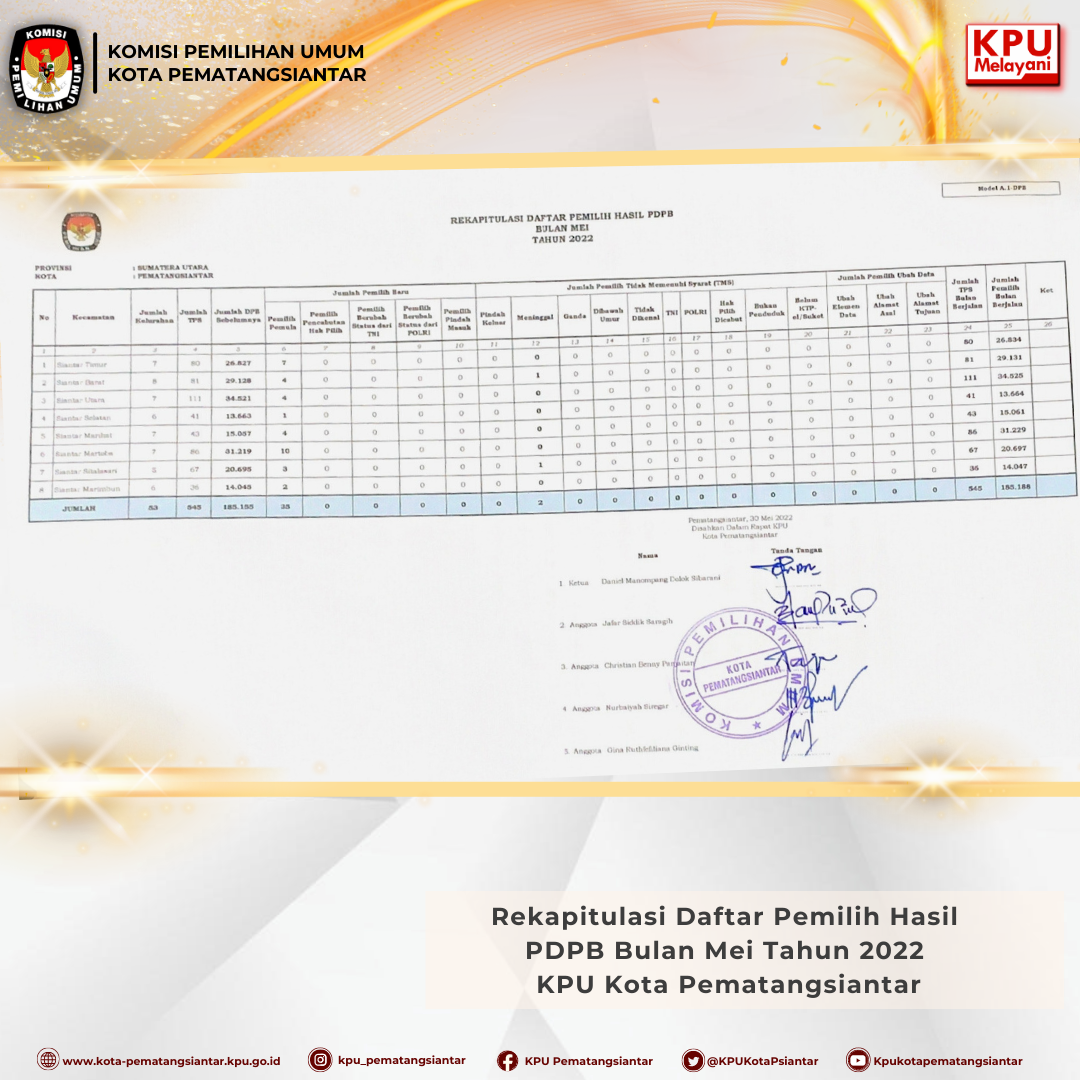 Hasil Rekapitulasi Daftar Pemilih Berkelanjutan periode Bulan Mei 2022 KPU Kota Pematangsiantar dapat didownload melalui link berikut KLIK DISINI.