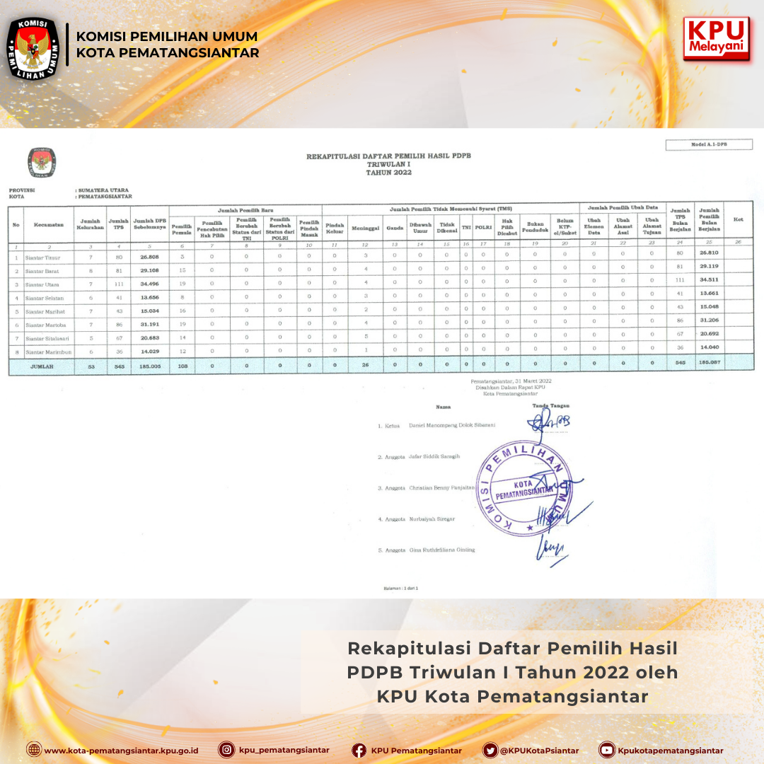 Hasil Rekapitulasi Daftar Pemilih Berkelanjutan periode Bulan Maret Tahun 2022 KPU Kota Pematangsiantar dapat didownload melalui link berikut KLIK DISINI