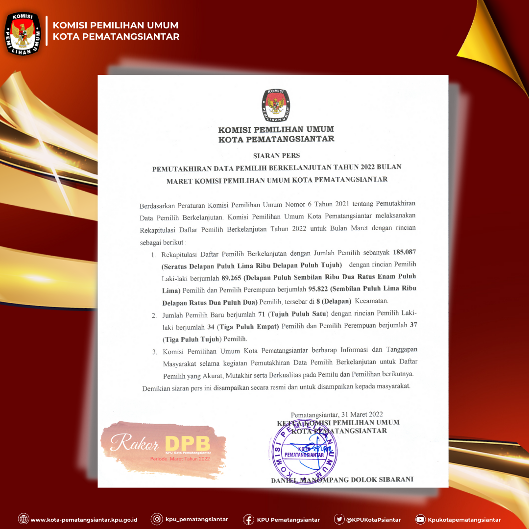 Dalam Rapat Koordinasi tersebut menetapkan Jumlah Daftar Pemilih Berkelanjutan (DPB) Bulan Maret Tahun 2022 sebanyak 185.087 (Seratus Delapan Puluh Lima Ribu Delapan Puluh Tujuh) Pemilih, dengan rincian: Pemilih Laki-laki sebanyak 89.265 (Delapan Puluh Sembilan Ribu Dua Ratus Enam Puluh Lima) Pemilih dan Pemilih Perempuan sebanyak 95.822 (Sembilan Puluh Lima Ribu Delapan Ratus Dua Puluh Dua) Pemilih, yang tersebar di 8 Kecamatan dan 53 Kelurahan Kota Pematangsiantar.