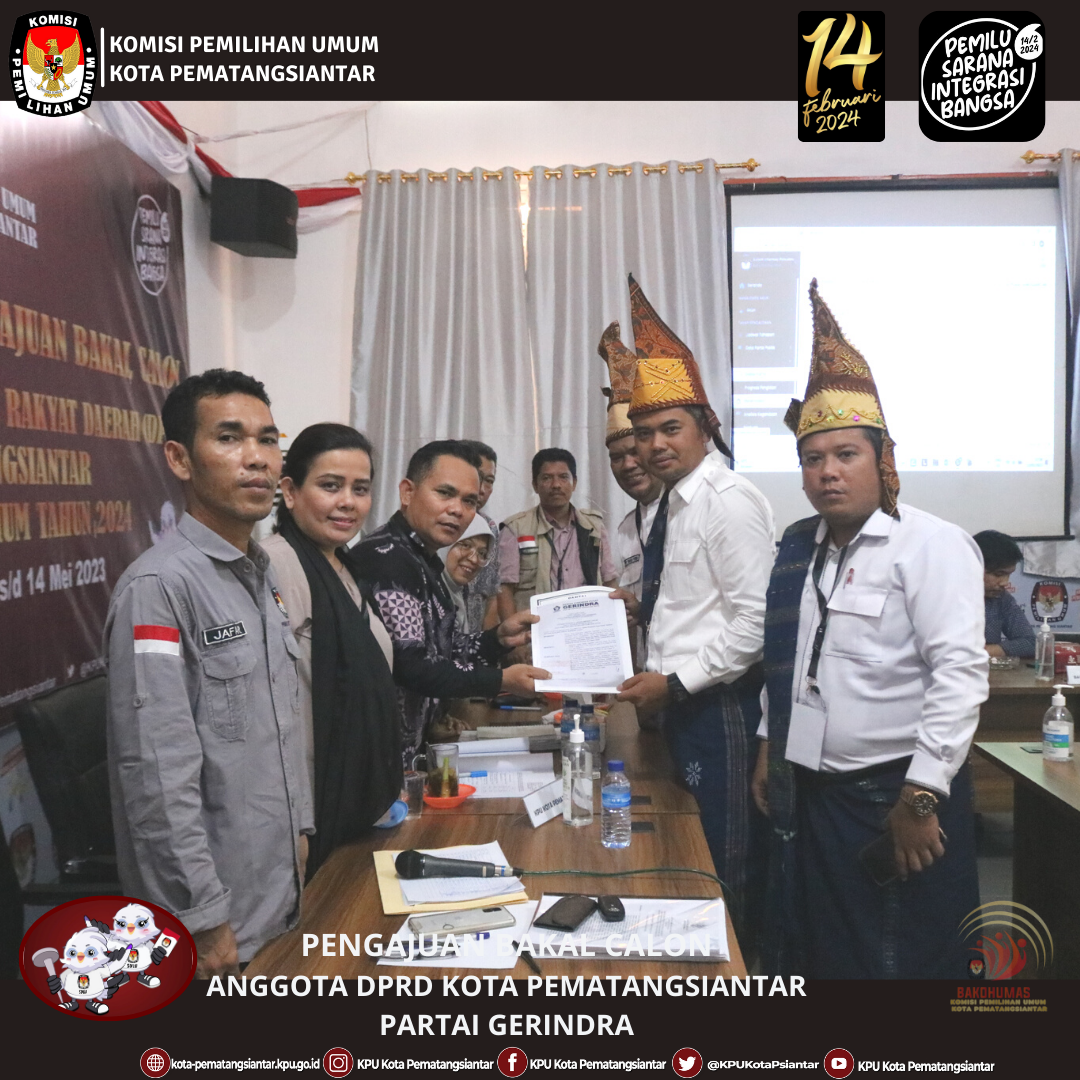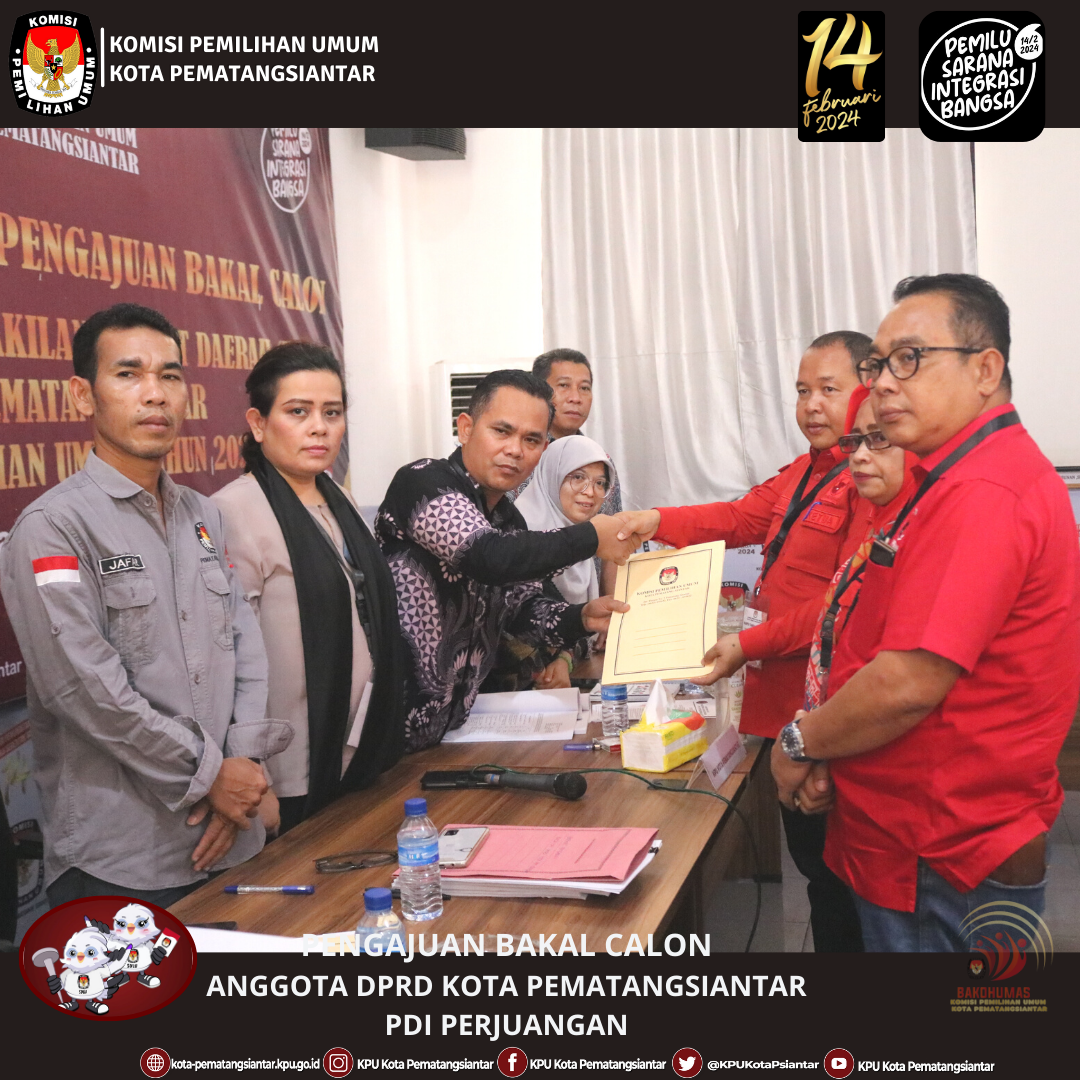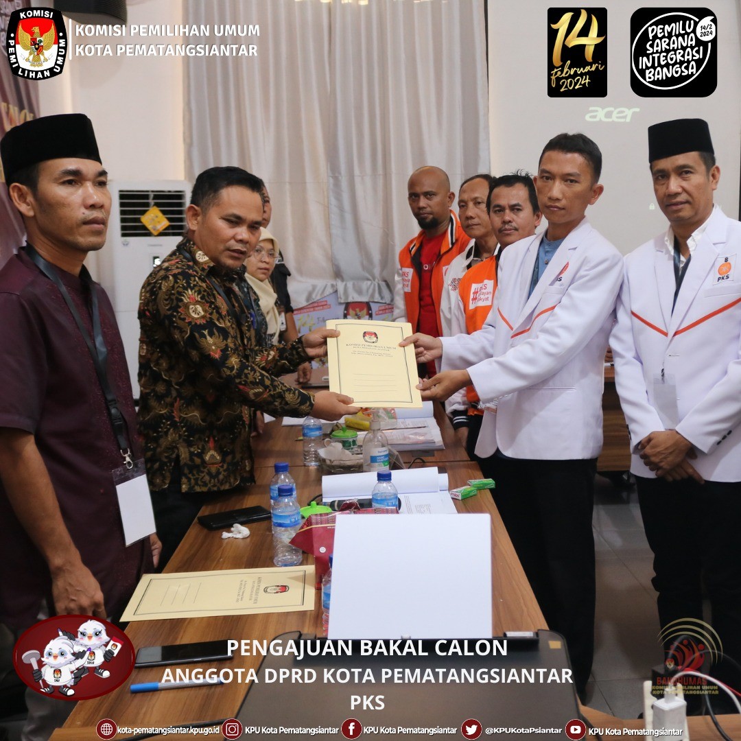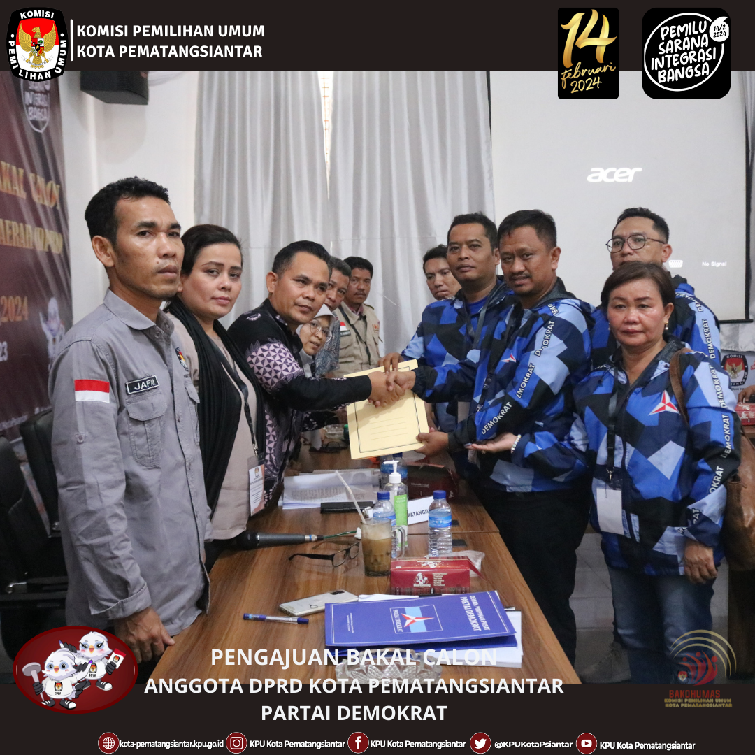 Pematangsiantar, kota-pematangsiantar.kpu.go.id– Partai Demokrat mengajukan Bakal Calon Anggota DPRD Kota Pematangsiantar Pemilu Serentak Tahun 2024, Sabtu, 13/5/2023 di Kantor KPU Kota Pematangsiantar. Pengajuan dilakukan oleh Ketua Partai Demokrat Ilhamsyah Sinaga, Sakti Sihombing Sekretaris Partai Demokrat didampingi Pengurus Partai Demokrat Tingkat Kota Pematangsiantar. Rombongan Partai Demokrat diterima oleh Ketua KPU Kota Pematangsiantar Daniel Manompang Dolok Sibarani, Anggota KPU Kota Pematangsiantar, Jafar Siddik Saragih, Gina Ruthfefiliana Ginting, Christian Benny Panjaitan, Nurbaiyah Siregar bersama Sekretaris KPU Kota Pematangsiantar, Hermanto Panjaitan didampingi Sekretariat KPU Kota Pematangsiantar, di Kantor KPU Kota Pematangsiantar dan disaksikan Ketua Bawaslu Kota Pematangsiantar Junita Lila Sinaga, Nanang Wahyudi Harahap dan Syafi Siregar Anggota Bawaslu Kota Pematangsiantar beserta Staf Sekretariat Bawaslu Kota Pematangsiantar. Partai Demokrat mengajukan Bakal Calon Anggota DPRD Kota Pematangsiantar Pemilu Serentak Tahun 2024 sejumlah 30 (tiga puluh) orang yang tersebar di Daerah Pemilihan (DAPIL) Pematangsiantar 1 : 10 (sepuluh) orang, Dapil 2 : 9 (Sembilan) orang dan Dapil 3 : 11 (sebelas) orang.