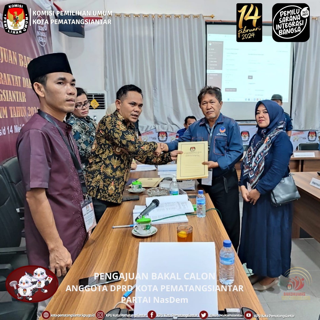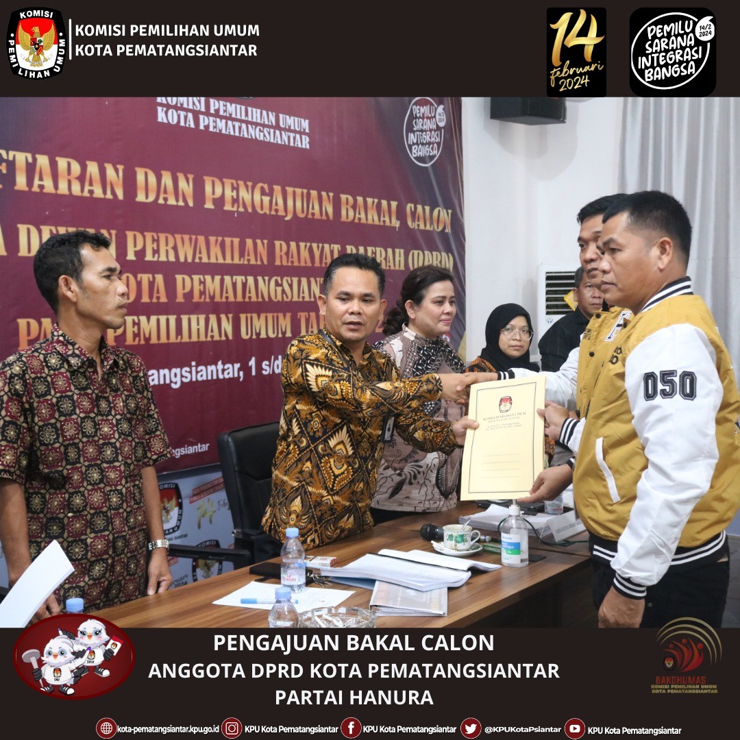 Pematangsiantar, kota-pematangsiantar.kpu.go.id– Partai Hati Nurani Rakyat (HANURA) mengajukan Bakal Calon Anggota DPRD Kota Pematangsiantar Pemilu Serentak Tahun 2024, Kamis (11/5/2023) di Kantor KPU Kota Pematangsiantar. Pengajuan dilakukan oleh Ketua Partai Hanura Ronald Darwin Tampubolon, didampingi Sekretaris Jimmy Safri Gultom serta Pengurus Partai Hanura 15.00 WIB. Partai Hanura diterima oleh Ketua KPU Kota Pematangsiantar Daniel Manompang Dolok Sibarani, Anggota KPU Kota Pematangsiantar, Jafar Siddik Saragih, Gina Ruthfefiliana Ginting, Christian Benny Panjaitan, Nurbaiyah Siregar bersama Sekretaris KPU Kota Pematangsiantar, Hermanto Panjaitan didampingi Sekretariat KPU Kota Pematangsiantar, di Kantor KPU Kota Pematangsiantar dan disaksikan Ketua Bawaslu Kota Pematangsiantar Lila Junita Sinaga dan Anggota Bawaslu Kota Pematangsiantar. Partai Hanura mengajukan Bakal Calon Anggota DPRD Kota Pematangsiantar Pemilu Serentak Tahun 2024 sejumlah 30 (tiga puluh) orang yang tersebar di Daerah Pemilihan (DAPIL) Pematangsiantar 1 : 10 (sepuluh) orang, Dapil 2 : 9 (Sembilan) orang dan Dapil 3 : 11 (sebelas) orang.