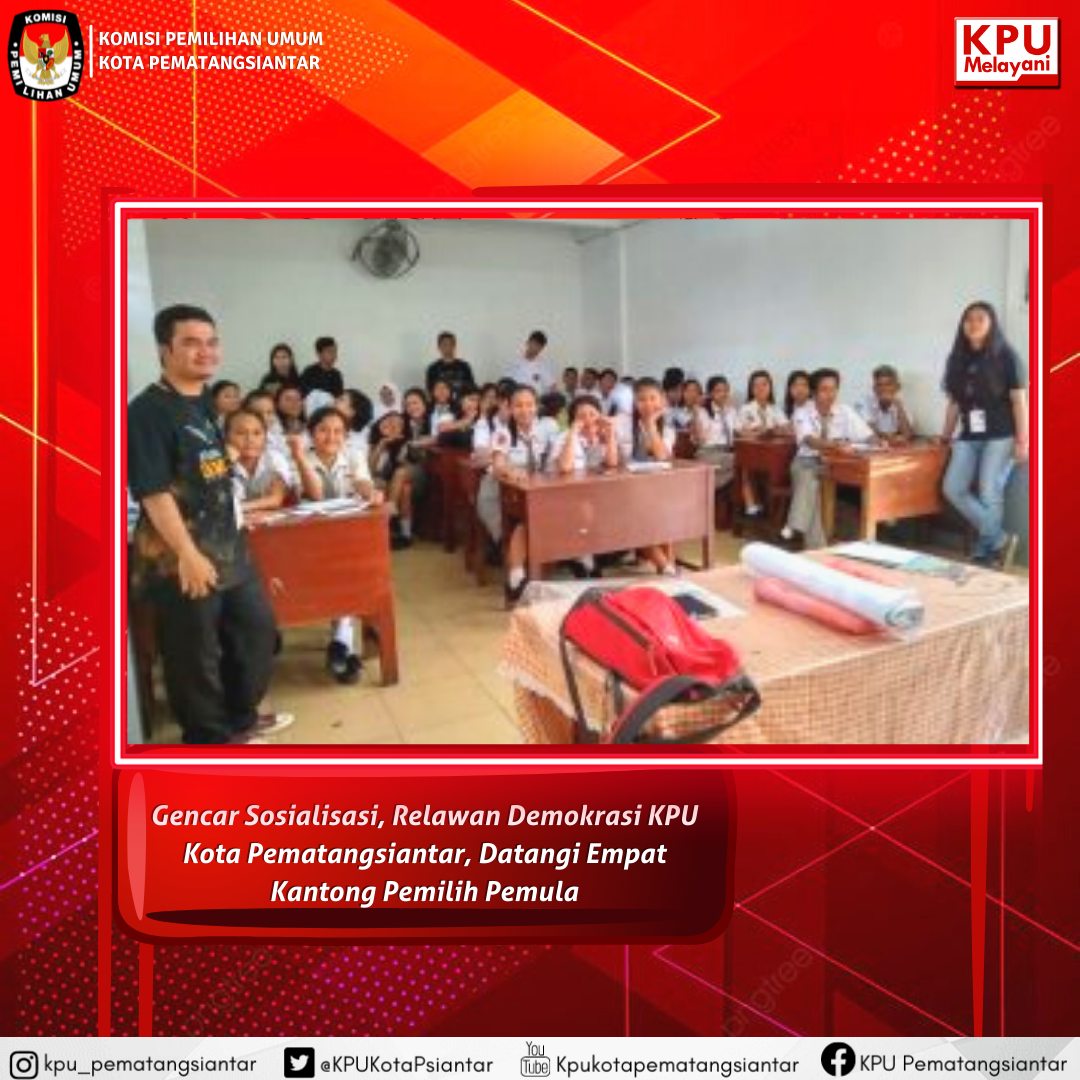 Pematangsiantar, kota-pematangsiantar.kpu.go.id – Semakin dekatnya hari pemungutan suara, 17 April 2019, Relawan Demokrasi (Relasi) Komisi Pemilihan Umum (KPU) Kota Pematangsiantar gencar melakukan sosialisasi ke berbagai segmen pemilih. Sosialisasi digelar di tiga tempat, hari Selasa (29/1/2019) yang bertempat di Mas Alwashliyah 67 Kota Pematangsiantar pada pukul 08:30 WIB s/d 11:30 WIB sebanyak 54 orang, hari Kamis (31/1/2019) bertempat di SMA Kartika I-4 Kota Pematangsiantar pada pukul 08:00 WIB s/d 10:00 WIB sebanyak 172 orang, hari Rabu (6/2/2019) bertempat di Sekolah SMA Mars Kota Pematangsiantar dari pukul 09:00 WIB s/d 11:30 WIB sebanyak 40 orang, dan hari Kamis (14/2/2019) bertempat di STAI Samora Kota Pematangsiantar pada pukul 16:00 WIB s/d 17:30 WIB sebanyak 43 orang peserta. Metode yang dilakukan dalam kegiatan soalisasi ini adalah dengan metode ceramah dan tanya jawab. Dalam kegiatan soalisasi ini, pihak pemateri memberikan informasi mengenai bagaimana pelaksanaan Pemilihan Umum Serentark Tahun 2019. Respon dan tanggapan Siswa/I dalam menerima informasi tentang Pemilu Serentak 2019 sangat antusias, hal tersebut, dapat dilihat dari semangat dan keceriaan serta banyaknya tanya jawab. (by admin:nsu) (Sumber : Relasi, J Pratama)