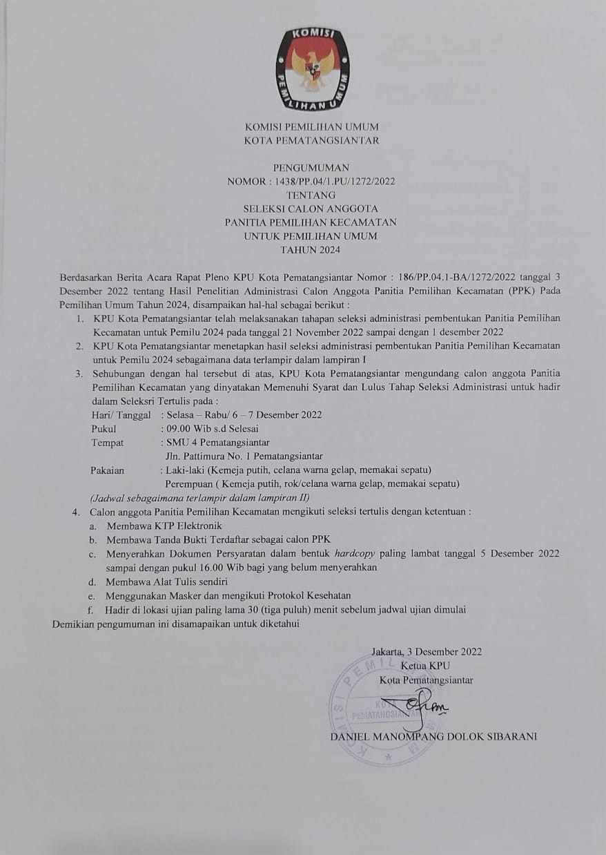 Pematangsiantar, kota-pematangsiantar.kpu.go.id Berdasarkan pada Berita Acara Komisi Pemilihan Umum Kota Pematangsiantar Nomor : 165/PL.01.1-RANCANGAN AWAL/1272/2022 tentang Rancangan Penataan Daerah Pemilihan dan Alokasi Kursi Anggota Dewan Perwakilan Rakyat Daerah Kabupaten/Kota dalam Pemilihan Umum Tahun 2024, dengan ini mengumumkan Rancangan Penataan Daerah Pemilihan dan Alokasi Kursi Anggota Dewan Perwakilan Rakyat Daerah Kota Pematangsiantar dalam Pemilihan Umum Tahun 2024 untuk dapat mendapatkan tanggapan dan masukan masyarakat sebagaimana tercantum dalam lampiran pengumuman ini. Masyarakat dapat memberikan masukan dan tanggapan dengan cara sebagai berikut: Penerimaan masukan dan tanggapan masyarakat terhadap Rancangan Penataan Daerah Pemilihan dan Alokasi Kursi Anggota Dewan Perwakilan Rakyat Daerah Kota Pematangsiantar dalam Pemilihan Umum Tahun 2024 dilaksanakan pada tanggal 23/11/2022 s.d 6/12/2022 Masukan dan Tanggapan Masyarakat dibuat secara tertulis sesuai dengan format yang dapat diperoleh di Kantor KPU Kota Pematangsiantar atau diunduh pada laman helpdesk.kpu.go.id/tanggapan. Penyampaian masukan dan tanggapan dilengkapi dengan: surat pengantar resmi bagi lembaga/badan/organisasi masyarakat/partai politik; atau identitas diri berupa fotokopi Kartu Tanda Penduduk Elektronik bagi perorangan. Penyampaian dokumen masukan dan tanggapan masyarakat dapat disampaikan dengan cara: diantar langsung ke Kantor KPU Kota Pematangsiantar , Jalan Porsea No. 3 Kelurahan Teladan Kecamatan Siantar Barat Kota Pematangsiantar, pada tanggal 23 November s.d 6 Desember 2022, pukul 08.00- 16.00 waktu setempat; atau disampaikan melalui laman helpdesk.kpu.go.id/tanggapan. PENGUMUMAN https://kota-pematangsiantar.kpu.go.id/public/kota-pematangsiantar/dmdocument/1669198975PENGUMUMAN RANCANGAN DAPIL 1367.pdf TANGAPAN MASYARAKAT https://kota-pematangsiantar.kpu.go.id/public/kota-pematangsiantar/dmdocument/1669199222FORMULIR TANGGAPAN DAN MASUKAN MASYARAKAT.pdf Demikian pengumuman ini disampaikan untuk dapat diketahui masyarakat seluas-luasnya.