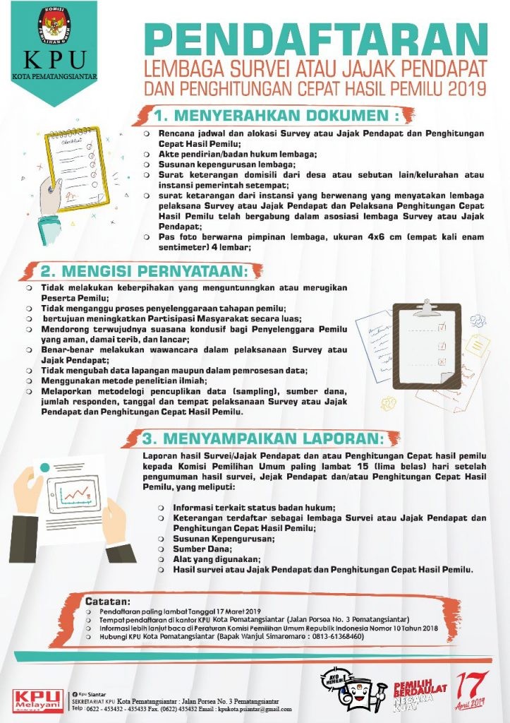 Pendaftaran Lembaga Survei atau Jajak Pendapat dan Penghitungan Cepat Hasil Pemilu 2019 Sabtu, 16 Februari 2019 00:00 631 Pematangsiantar, kota-pematangsiantar.kpu.go.id – Komisi Pemilihan Umum Kota Pematangsiantar membuka Pendaftaran Lembaga Survei atau Jajak Pendapat dan Penghitungan Cepat Hasil Pemilu 2109. Surat Pernyataan dapat di UNDUH DISINI. Baca Selengkapnya