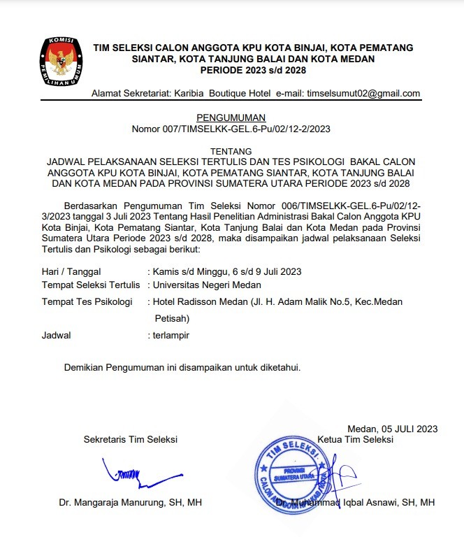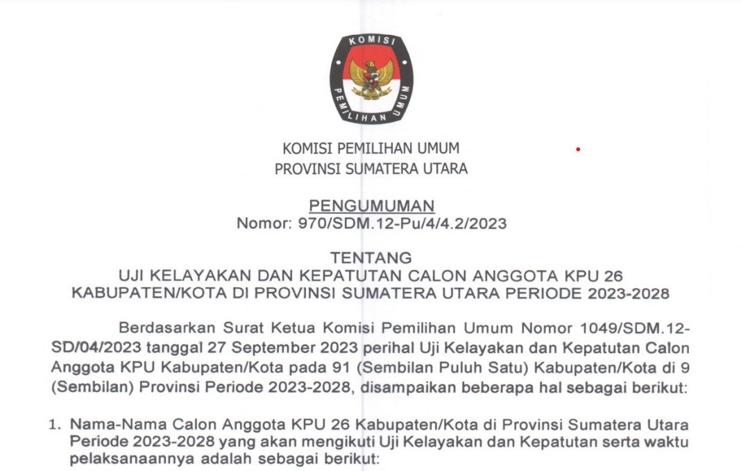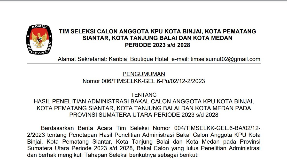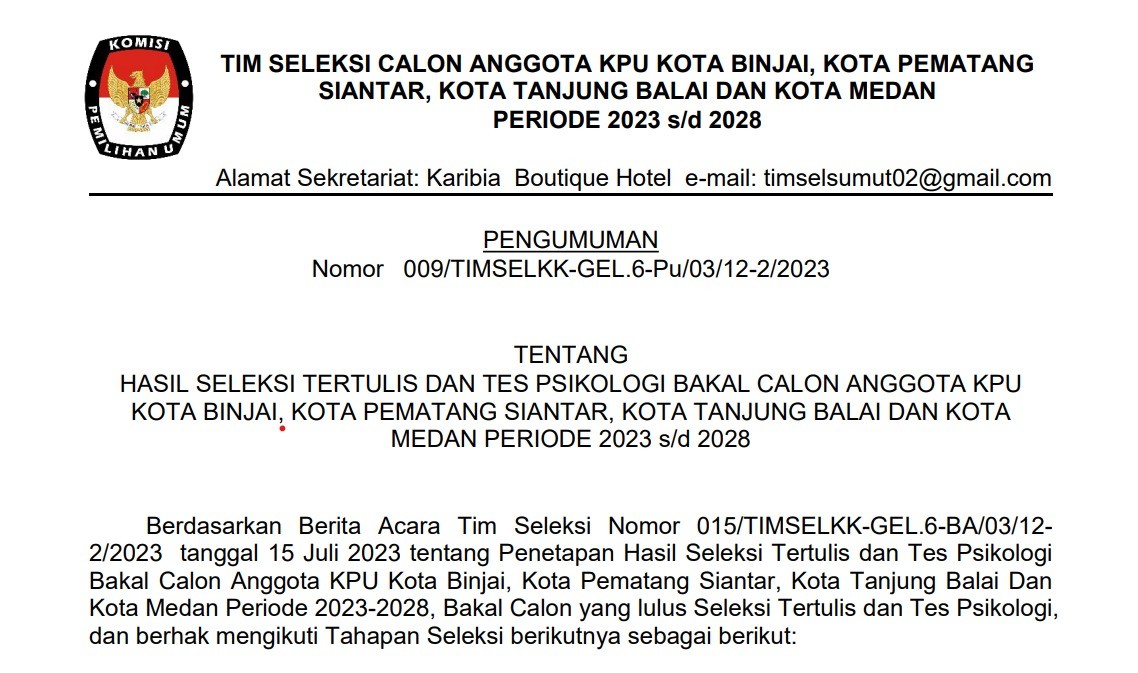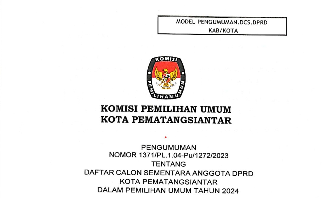 PENGUMUMAN NOMOR 1371/PL.1.04-Pu/1272/2023 TENTANG DAFTAR CALON SEMENTARA ANGGOTA DPRD KOTA PEMATANGSIANTAR DALAM PEMILIHAN UMUM TAHUN 2024 Pengumuman Selengkapnya di Bawah Ini Pengumuman Daftar Calon Sementara Anggota DPRD Kota Pematangsiantar Dalam Pemilu Tahun 2024 KLIK DISINI Salinan Keputusan KPU Kota Pematangsiantar Tentang Daftar Calon Sementara Anggota DPRD Kota Pematangsiantar Dalam Pemilu Tahun 2024 KLIK DISINI masyarakat dapat menyampaikan masukan dan tanggapan terhadap calon sementara Anggota DPR, DPRD provinsi, dan DPRD kabupaten/kota yang tercantum dalam Daftar Calon Sementara (DCS) dari tanggal 19 - 28 Agustus 2023. Untuk mendapatkan masukan dan tanggapan Masyarakat, memperhatikan hal-hal tersebut: Masukan dan tanggapan masyarakat disampaikan secara tertulis terkait dengan pemenuhan persyaratan administrasi bakal calon anggota DPRD Kota Pematangsiantar Masukan dan tanggapan masyarakat disertai dengan bukti identitas diri dan bukti yang relevan kepada KPU Kota Pematangsiantar melalui: website info pemilu KPU yaitu https://infopemilu.kpu.go.id kantor KPU Kota Pematangsiantar dengan alamat Jalan Porsea Nomor 3 Kota Pematangsiantar Provinsi Sumatera Utara email : subbagteknissiantar@gmail.com Informasi lebih lanjut dapat menghubungi helpdesk pencalonan KPU Kota Pematangsiantar