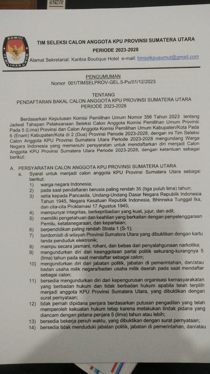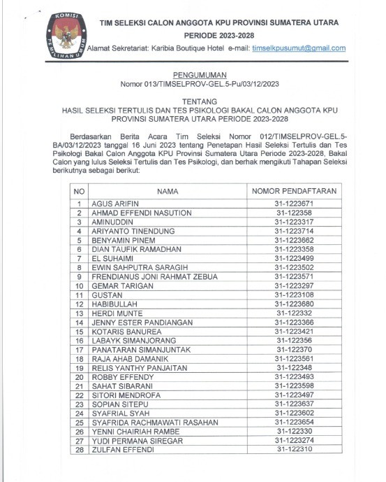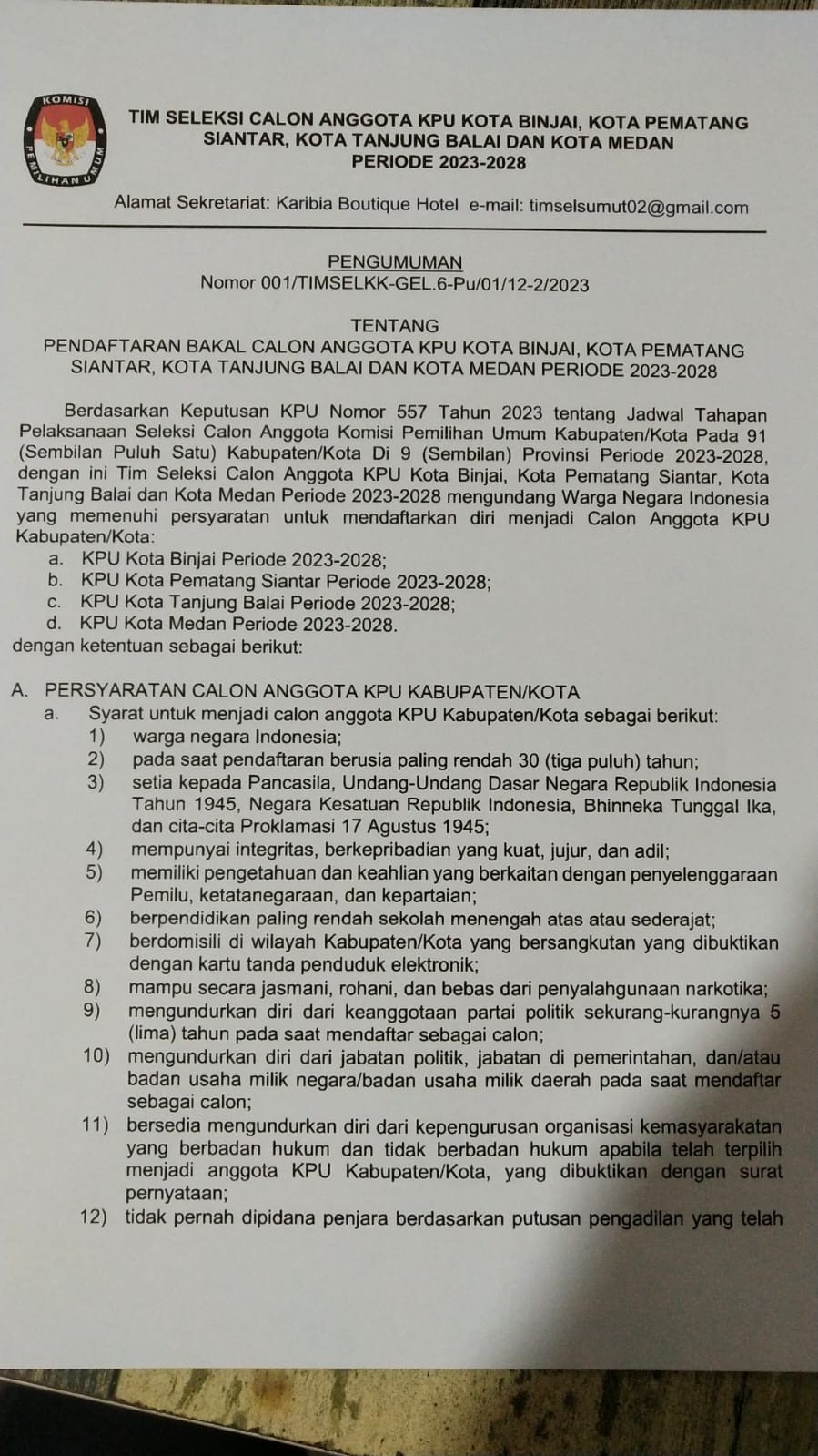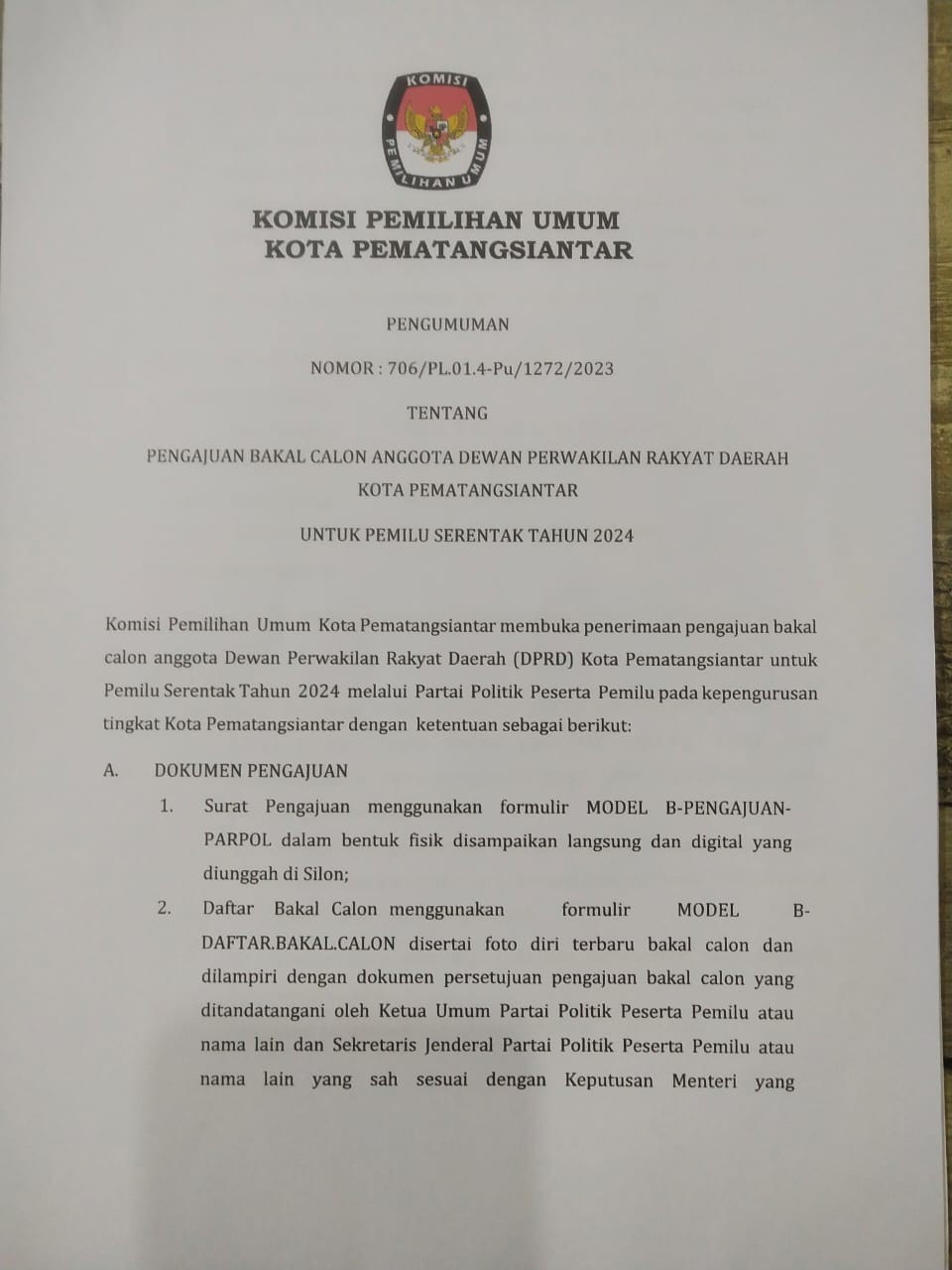 Komisi Pemilihan Umum Kota Pematangsiantar membuka penerimaan pengajuan bakal calon anggota Dewan Perwakilan Rakyat Daerah (DPRD) Kota Pematangsiantar untuk Pemilu Serentak Tahun 2024 melalui Partai Politik Peserta Pemilu pada kepengurusan tingkat Kota Pematangsiantar dengan ketentuan sebagai berikut: